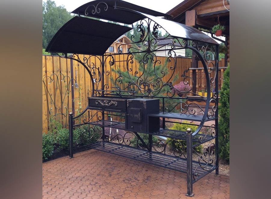 Модель отличается богатством и изысканностью внешнего вида благодаря эффектным кованым завиткам, украшающим заднюю стенку мангала. Двухъярусная крыша с дымоотводами отлично защищает от прямых солнечных лучей, снега, дождя за счет правильного угла ската и большого вылета.