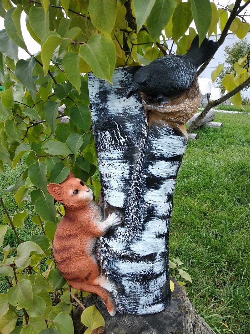 Садовая фигура навесная «Берёза с котом и вороной» – современный и изящный элемент дизайна садовых участков. С её помощью можно украсить любой сад или приусадебную территорию, придав им неповторимости и оригинальности.