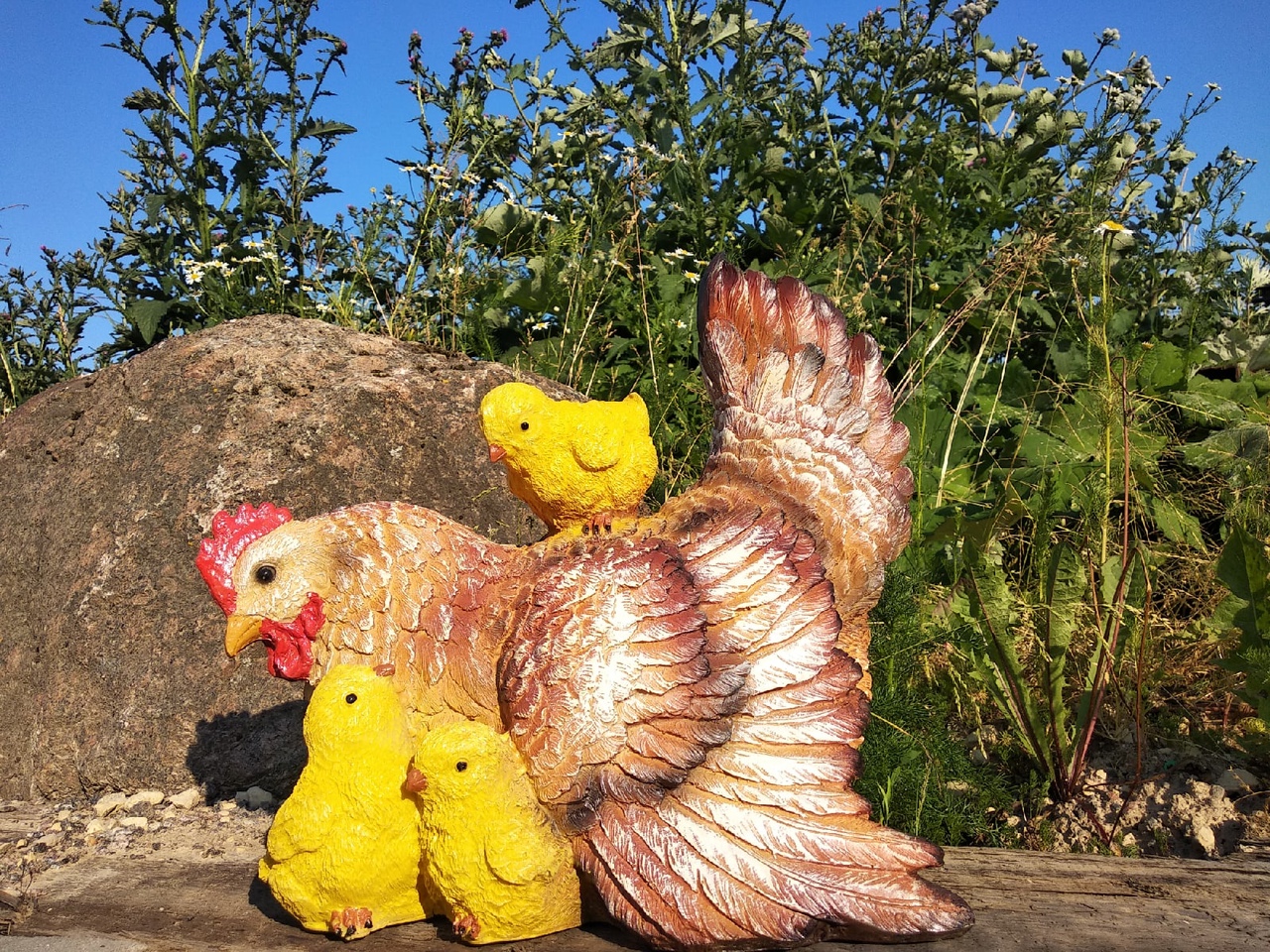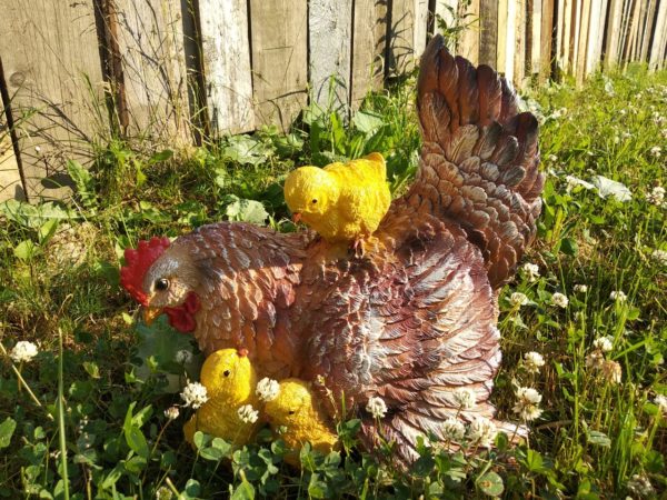 Курица-наседка с цыплятами используется в качестве украшения дачного участка. Изготовлена из полистоуна, который отличается атмосферостойкостью и не выцветает на солнце. Будет красиво смотреться в саду или на крыльце, украсит территорию и внесет изюминку в обстановку.