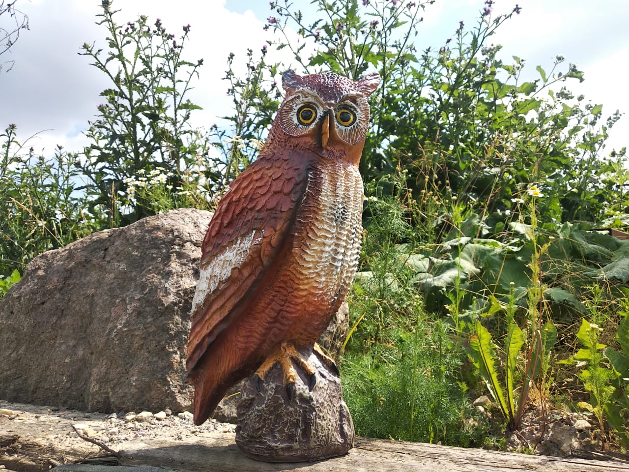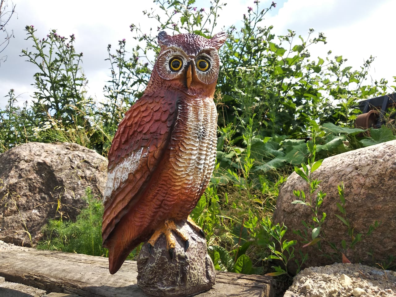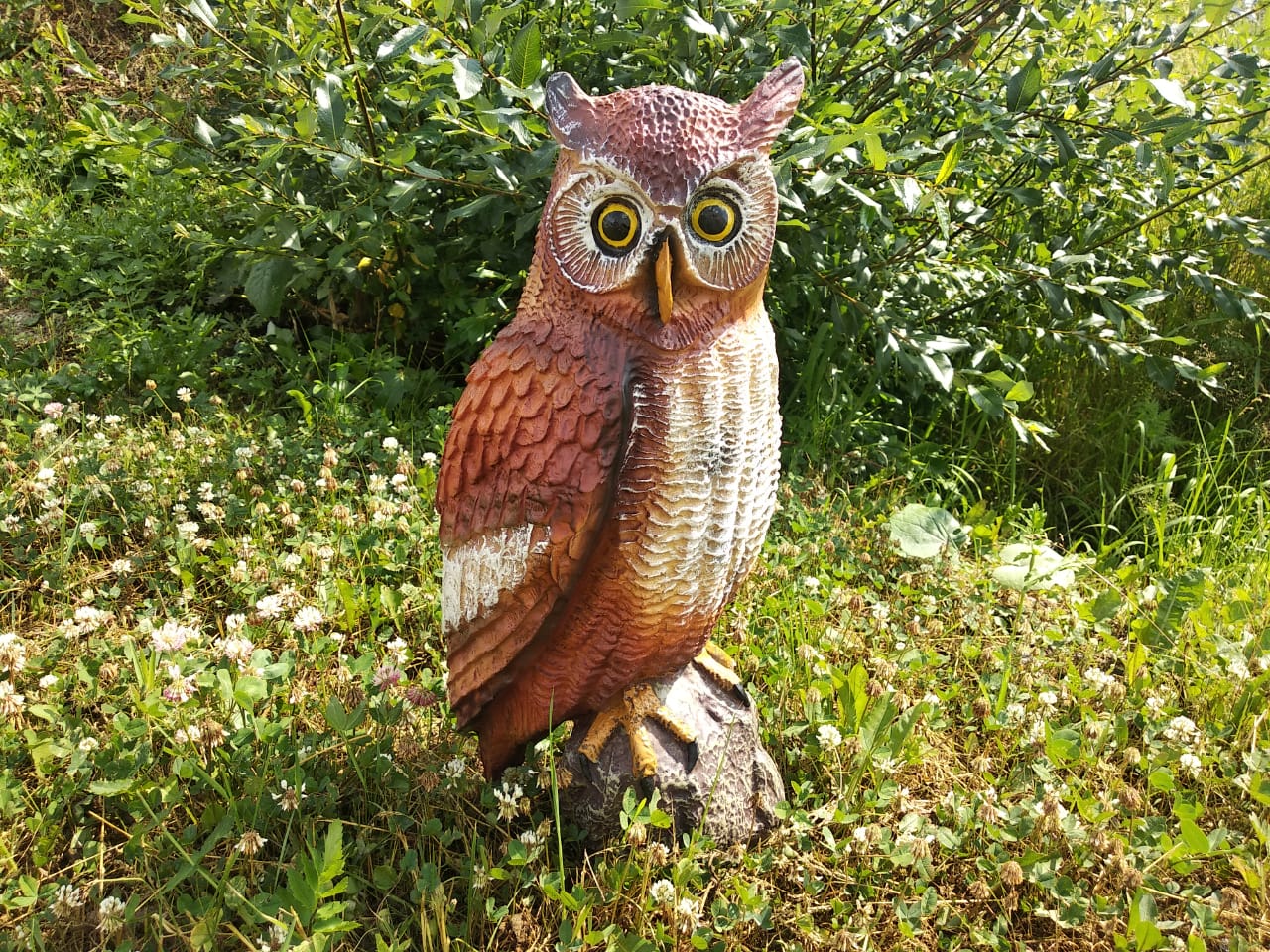 Сова не только красивое украшение для вашего сада, но и настоящий сторож. Совы охотятся на мелких грызунов, которые заметив сову, будут обходить ваш сад стороной.