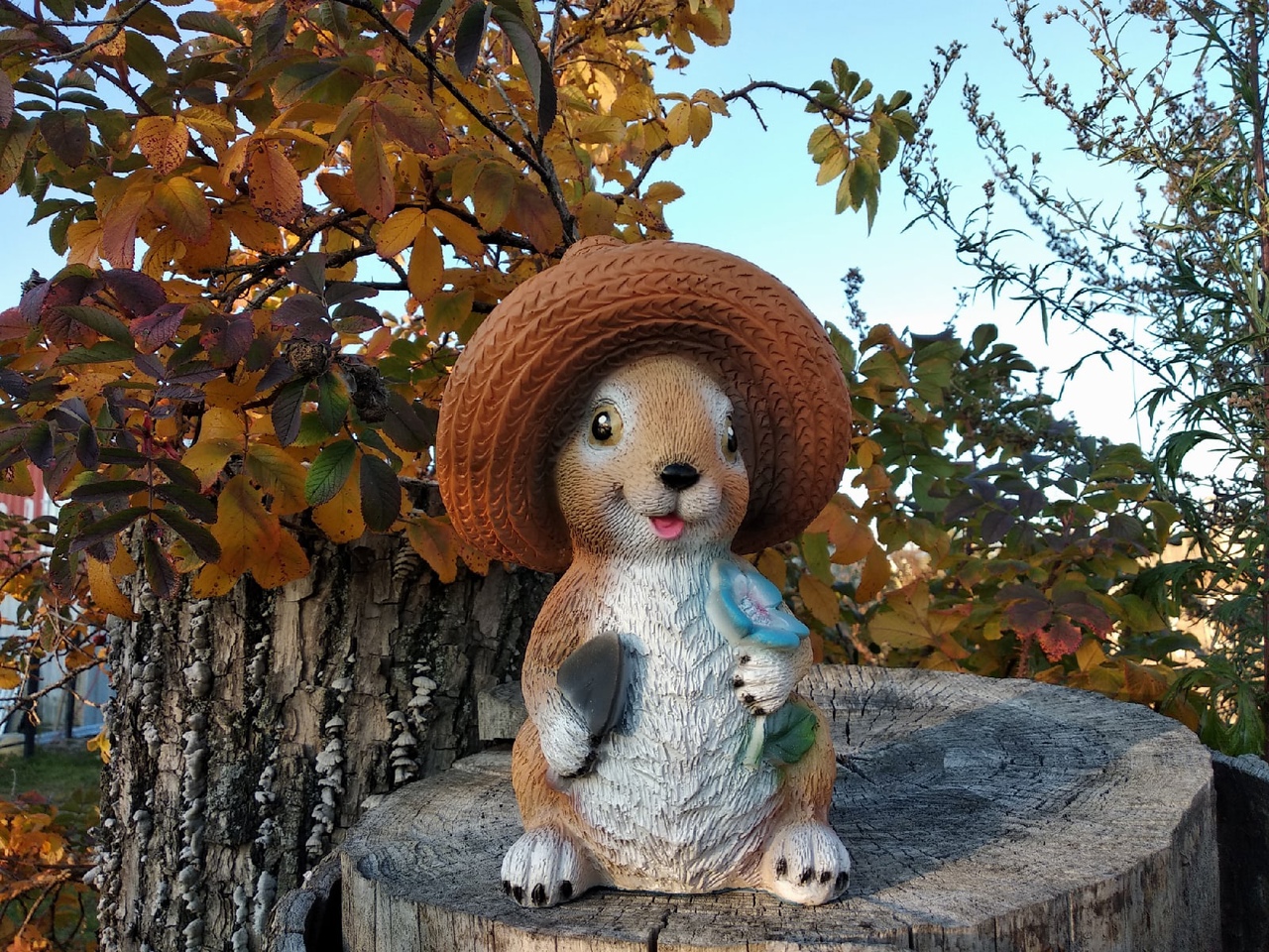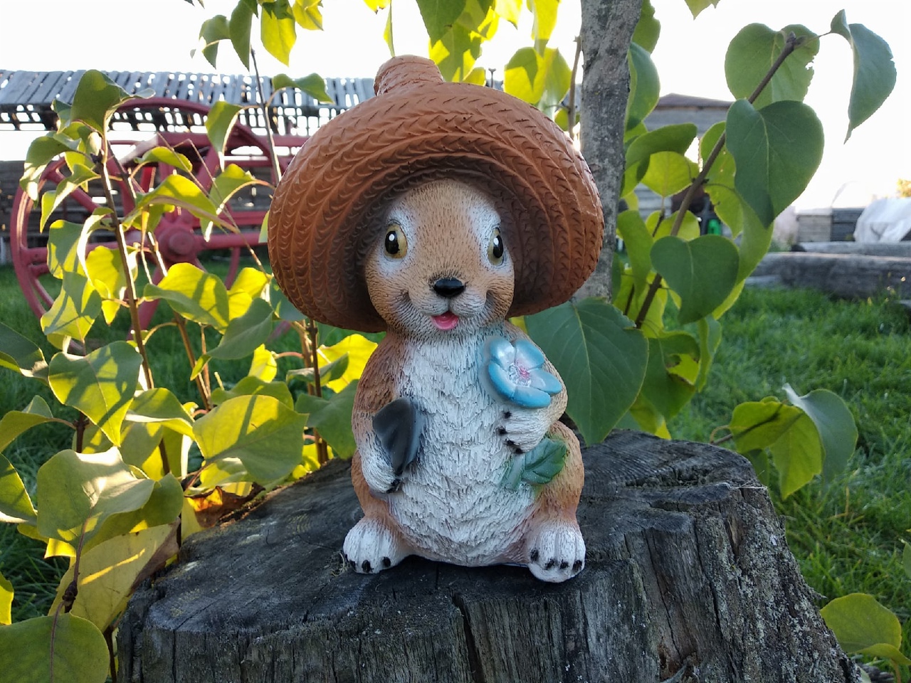 Садовая фигура Зайка в шляпе с лопаткой и цветком, 22х12х13 см.