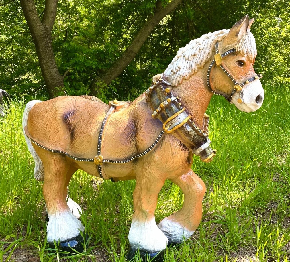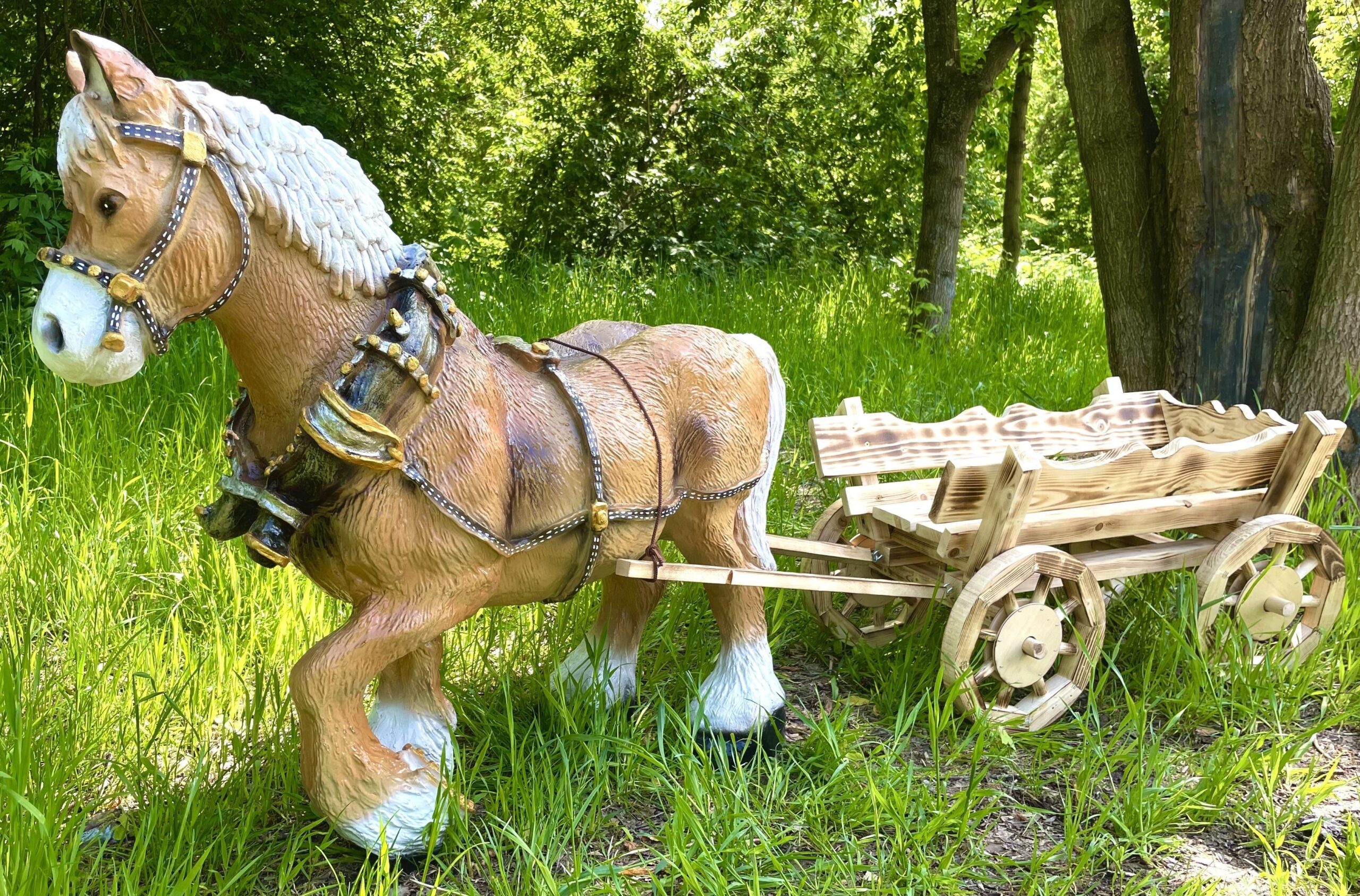 Садовая фигура «Лошадка с тележкой» пользуется большой популярностью среди дачников. Габаритные формы ( телега с лошадкой в сумме 2.25 м.) позволяют поставить эту композицию таким образом, что она будет видна всем, и станет настоящей гордостью хозяев загородного участка. Поверхность тележки можно приспособить для горшочков с бережно выращенными цветами. Задорная лошадка будто тащит за собой красивую тележку, перемещая ее по саду – эта композиция сама по себе законченная, а значит, не нуждается в дополнительном декоре. Сама фигурка лошадки сделана из современного материала полистоуна, который не даст изделию потерять свой прекрасный внешний вид.