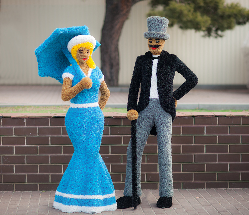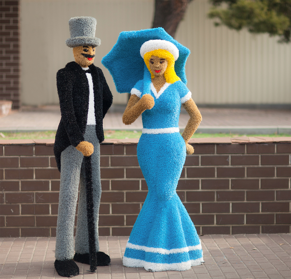 Топиарные фигуры Джентльмен и Дама с зонтом Очень гармоничное топиари изображающее мужчину в цилиндре одетого по моде 18-19 века. Как подобается истинному джентльмену у этой садовой скульптуры правильная осанка и трость в правой руке. Очень элегантно смотрится в компании с топиари «Дамой с зонтом».