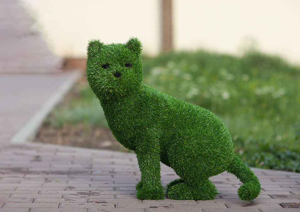 Топиари кот для декора городских парковых территорий, помещений развлекательных и торговых центров, магазинов, музеев, зоопарков, садовых участков. Каркас фигур из металла, отделка искусственная трава. Топиари используются для декора как улиц, так и помещений.