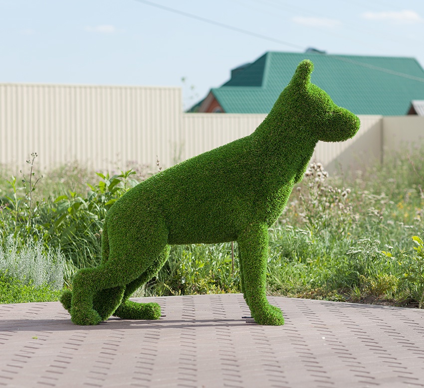 Топиари фигур животных в виде собаки из искусственной травы, у нас вы найдете сотни идей животных топиари, и даже если захочется чего-то отличного от имеющихся экспонатов, мы рады будем воплотить ваши идеи в реальность.