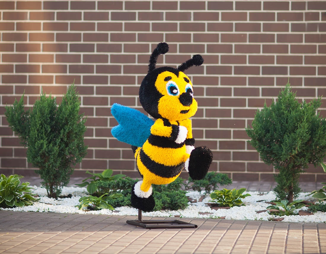 Отличным подарком ребенку послужит долговечный и не требующий сложного ухода пчелка-топиари. Небольшая, ярко-жёлтая фигурка пчёлки выглядит, как оживший персонаж мультика. Для натуралистичности создатели внесли в эскиз и черные полоски, яркие голубые крылышки.