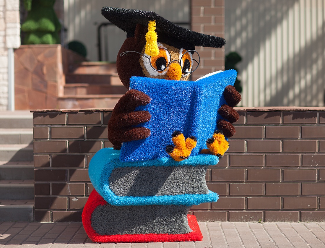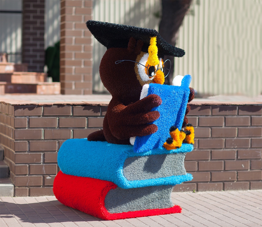 Топиари – «Сова на книгах» – скульптурное изображение ученой совы сидящей на книгах и держащую книгу в крыльях. Она вызывает ассоциации с символами образованности, грамоты, воспитанности, знаний и мудрости. Выполненная в технике топиари, эта скульптура станет прекрасным дополнением парковых зон и скверов возле учебных заведений для людей любых возрастов. Топиари для сада «Сова на книгах» изготовлена из стеклопластика, обшитого искусственным газоном разных цветов.
