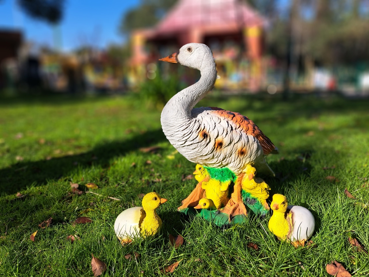 Симпатичная садовая фигура «Утка с утятами» – настоящий символ гармоничных семейных отношений. Эта пестрая утка, к которой льнут маленькие желтые утята, будет очень хорошо смотреться на участке, принадлежащем семье с детьми – на газоне посреди травы, в кустах или возле искусственного пруда. Прекрасный выбор для дома и дачи, который будет радовать вас достойным качеством.